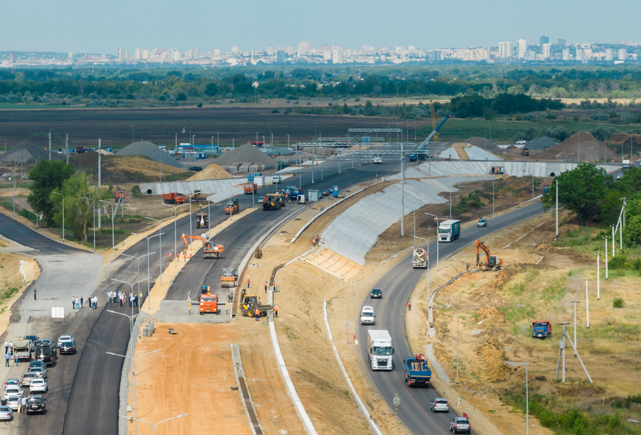 Работы по возведению магистрали ведутся сразу на нескольких участках: на основном ходе и съездах в два слоя укладывается асфальтовое покрытие, параллельно укрепляются обочины и откосы насыпи, монтируются водоотводные сооружения и наружное электроосвещение, подготавливается фундамент для шумозащитных экранов. На объекте работают 220 специалистов и разнообразная техника.